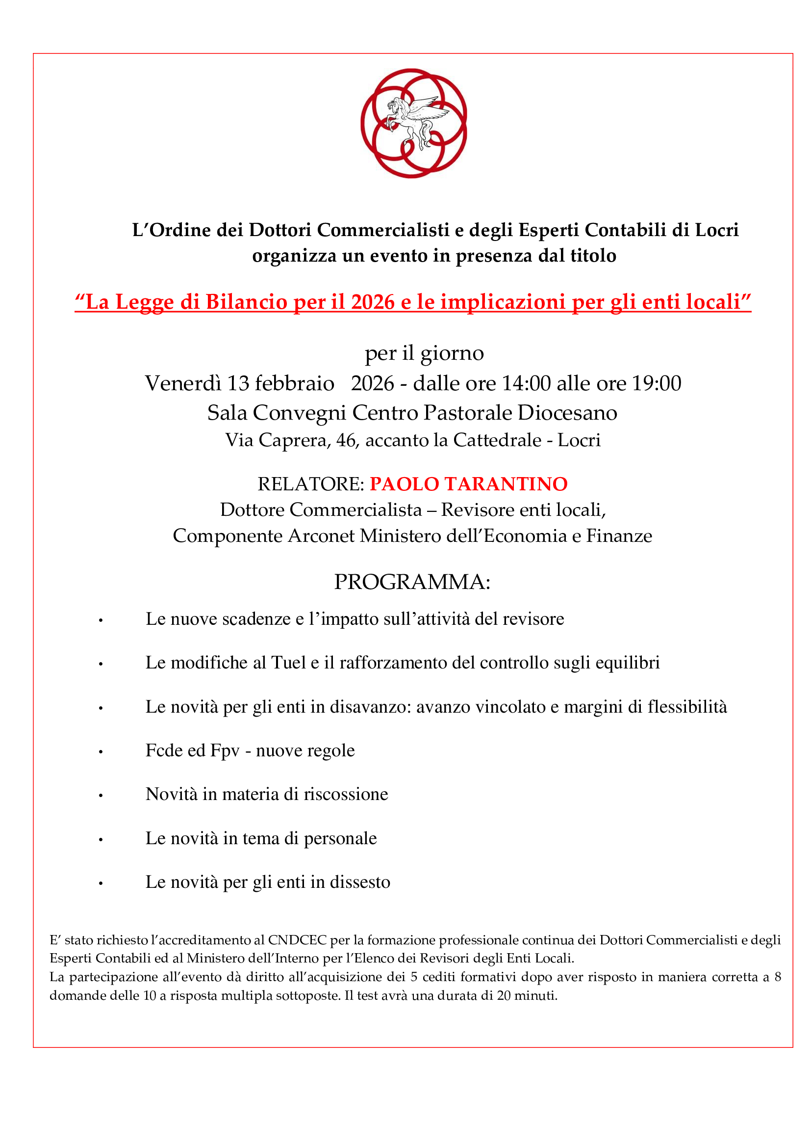 • 13 febbraio 2026 dalle ore 14.00 alle ore 19.00 – “La legge di bilancio per il 2026 e le implicazioni per gli enti locali” – n. 5 CFP;