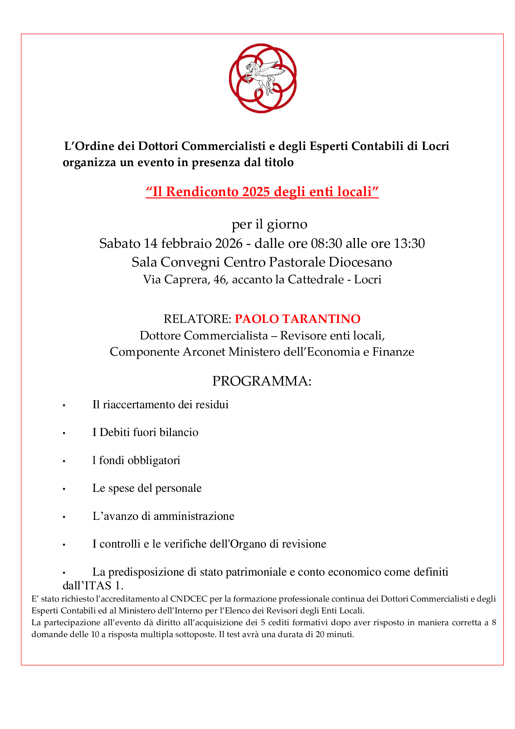 • 14 febbraio 2026 dalle ore 8.30 alle ore 13.30 – “Il rendiconto 2025 degli enti locali” – n. 5 CFP.